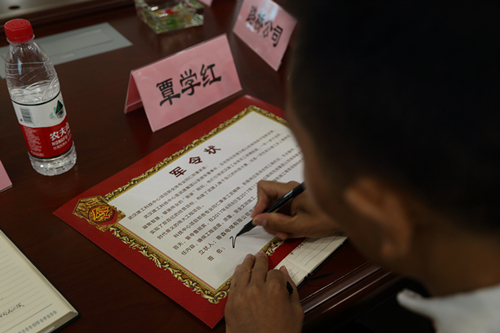 動員大會結(jié)束后,由各參建單位簽訂軍令狀,保證項目按期完成各項節(jié)點,順利交付使用。最后,由富強(qiáng)公司總經(jīng)理程曦與華達(dá)裝飾公司負(fù)責(zé)人張波完成武漢建工科技中心項目部“大戰(zhàn)一百天”動員會揭牌儀式。
