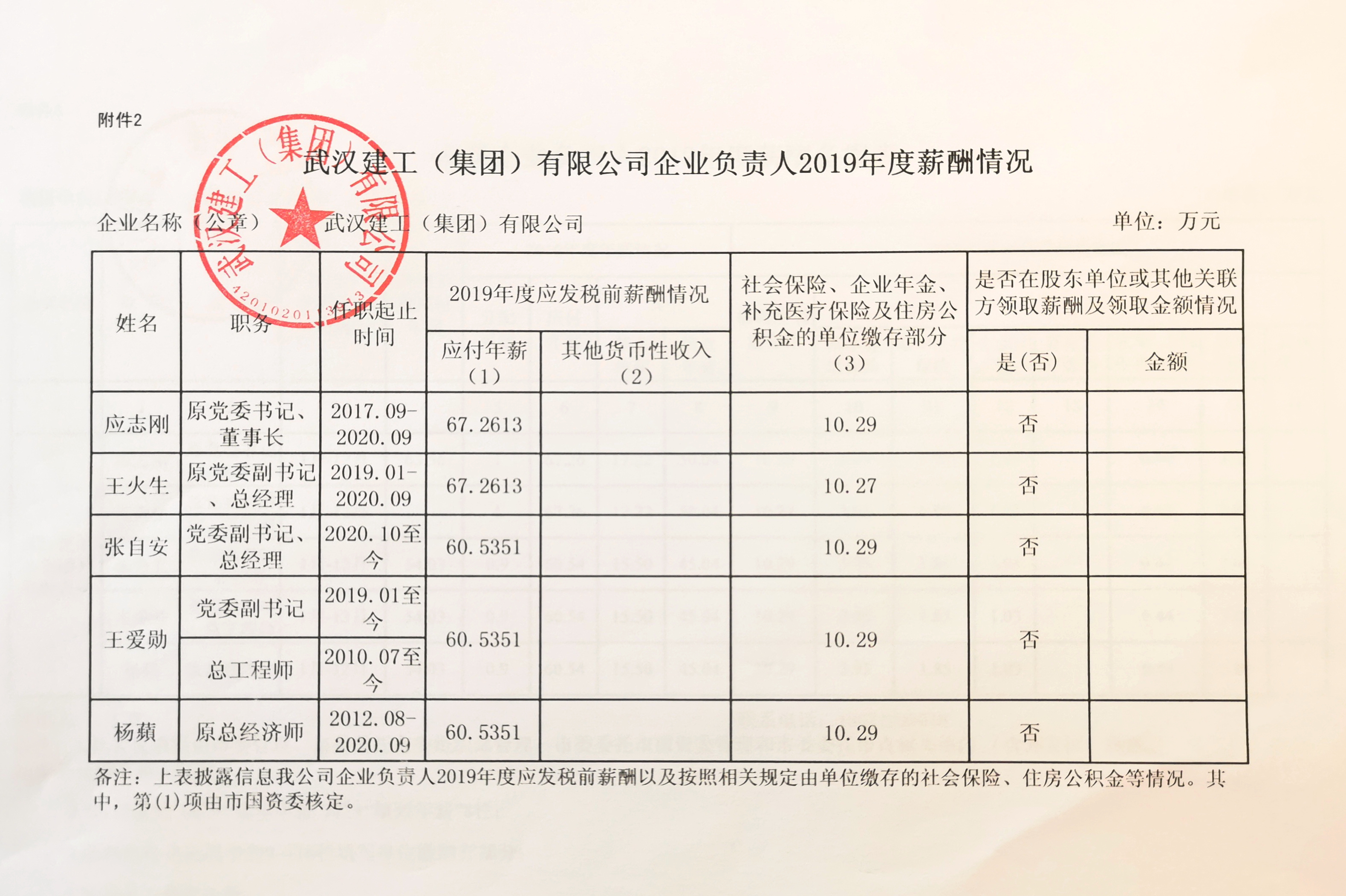 武漢建工(集團)有限公司企業負責人2019年度薪酬情況